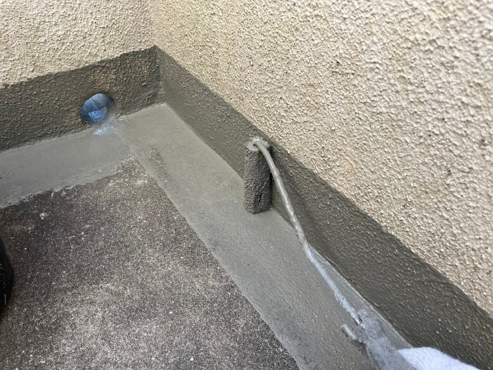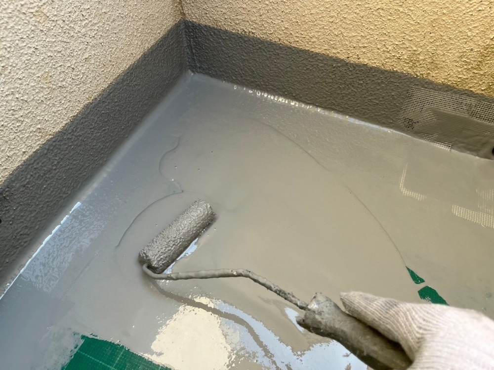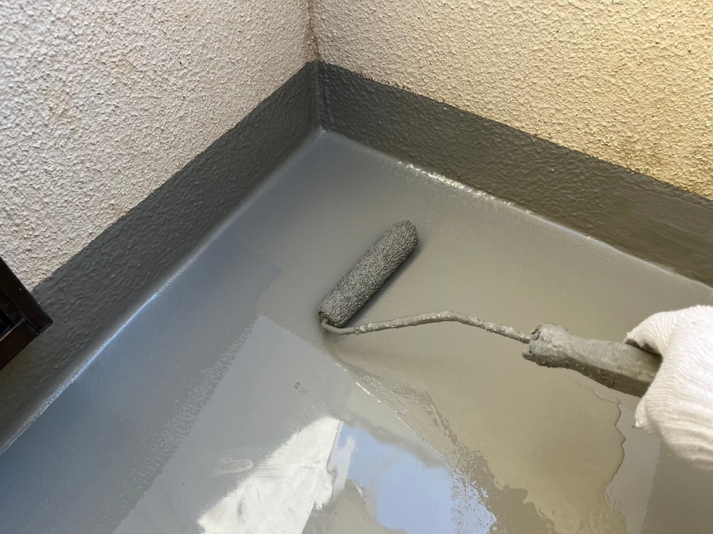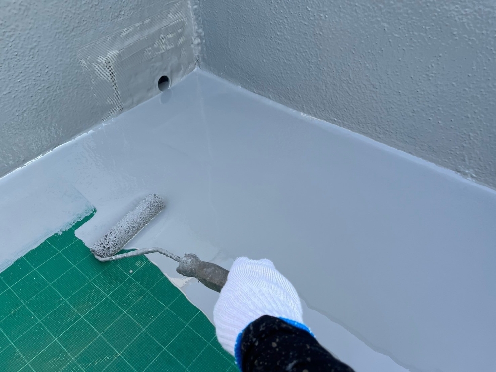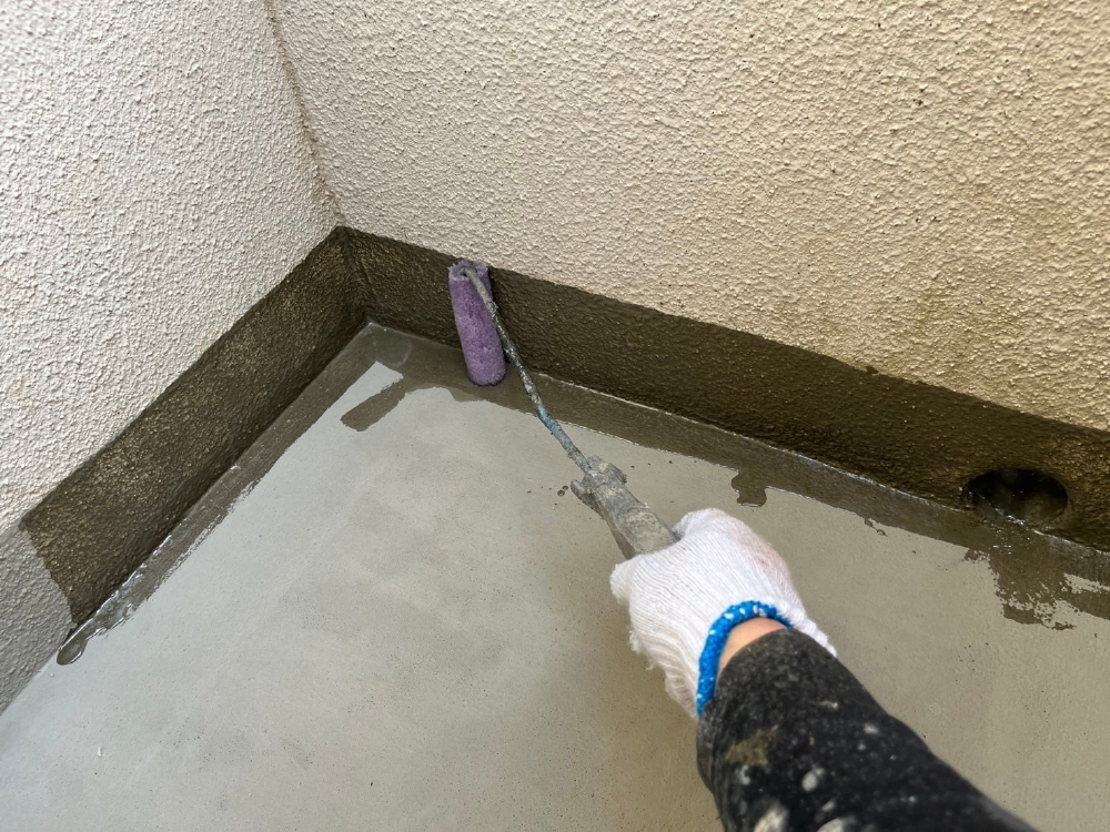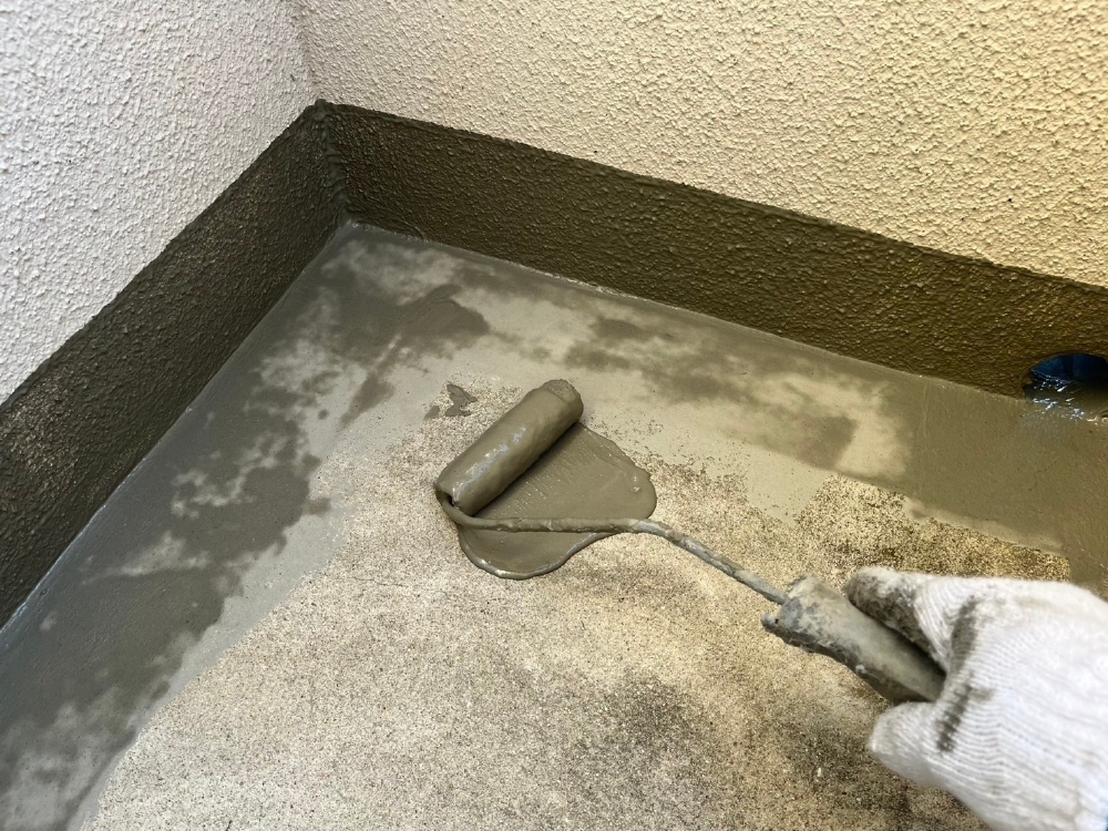 今回、屋上とベランダともに、立上りはウレタン樹脂を下地に直接塗布する密着工法を、