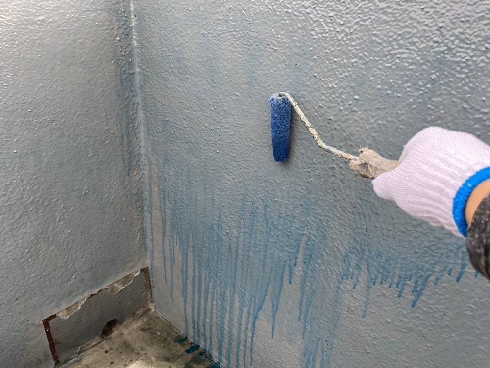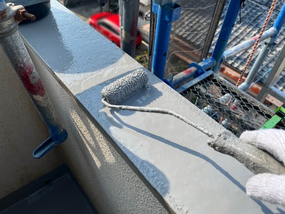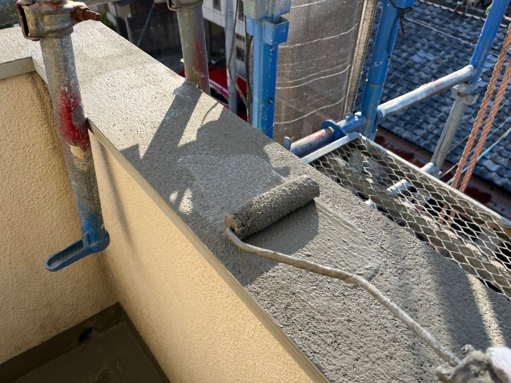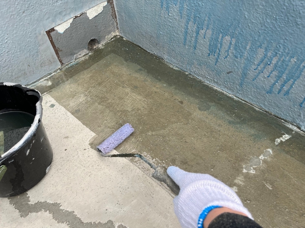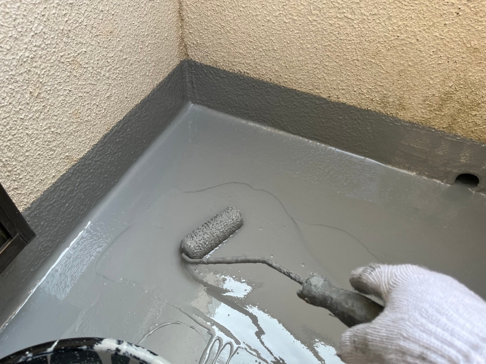 今回、屋上とベランダともに、立上りはウレタン樹脂を下地に直接塗布する密着工法を、