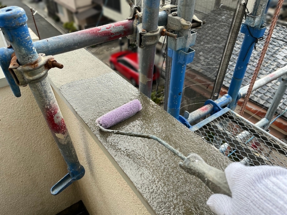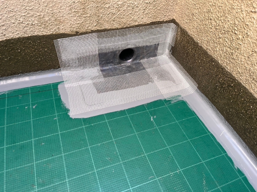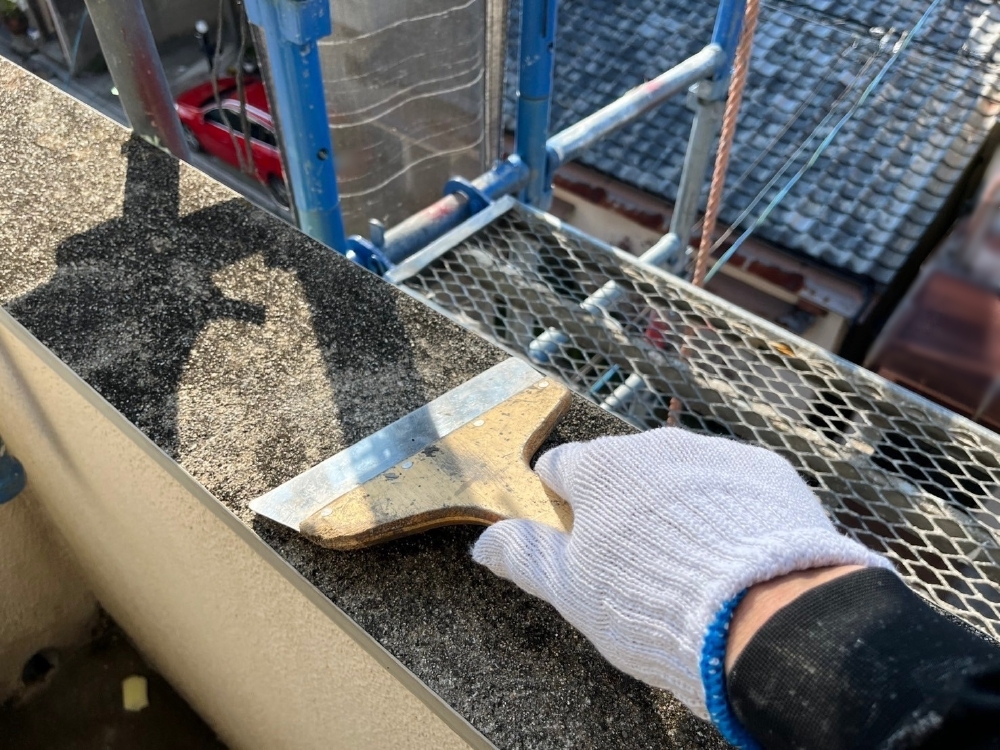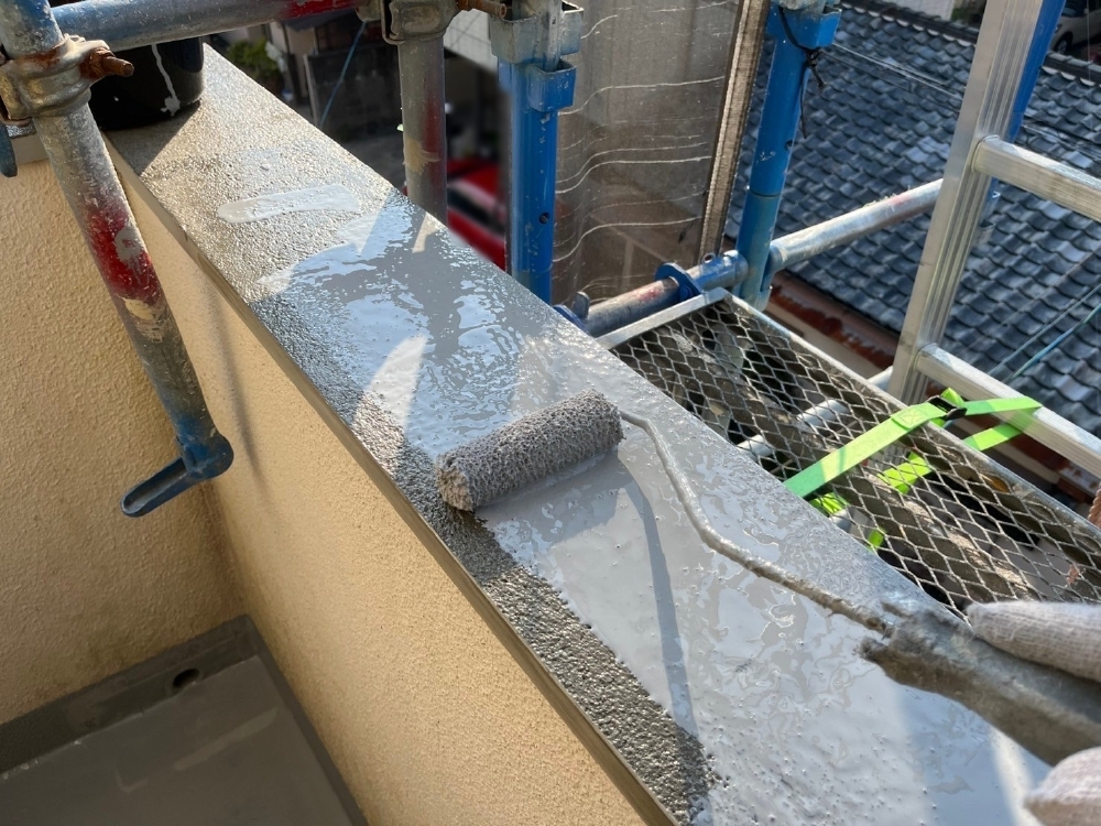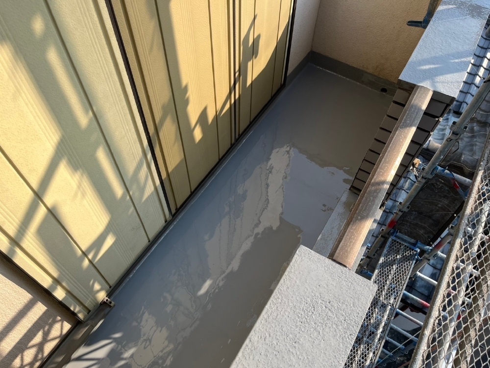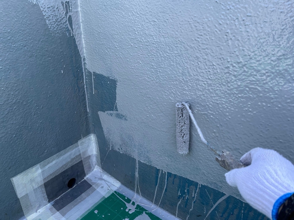 今回、屋上とベランダともに、立上りはウレタン樹脂を下地に直接塗布する密着工法を、