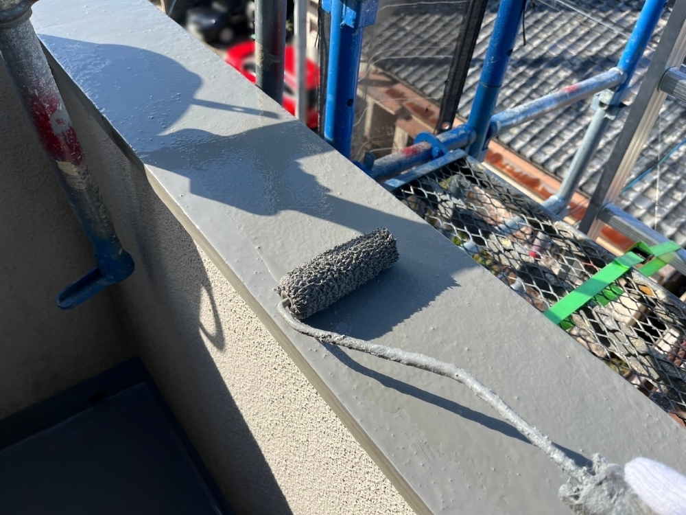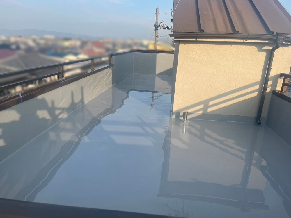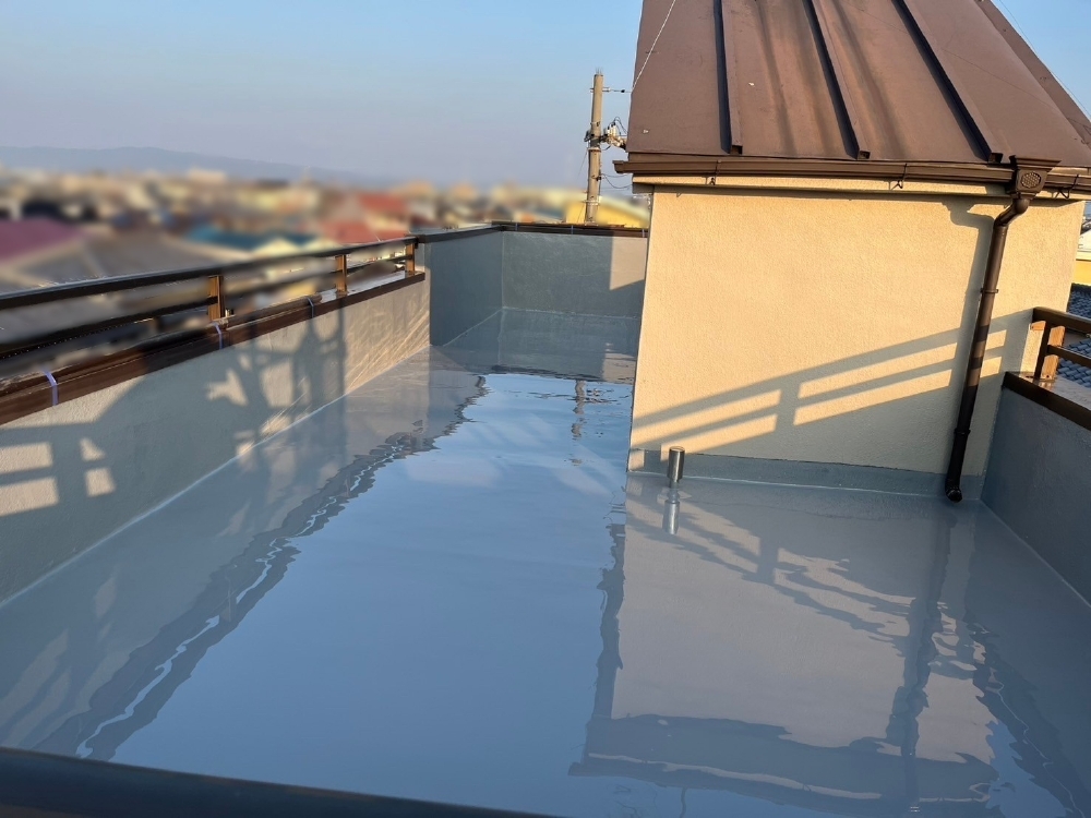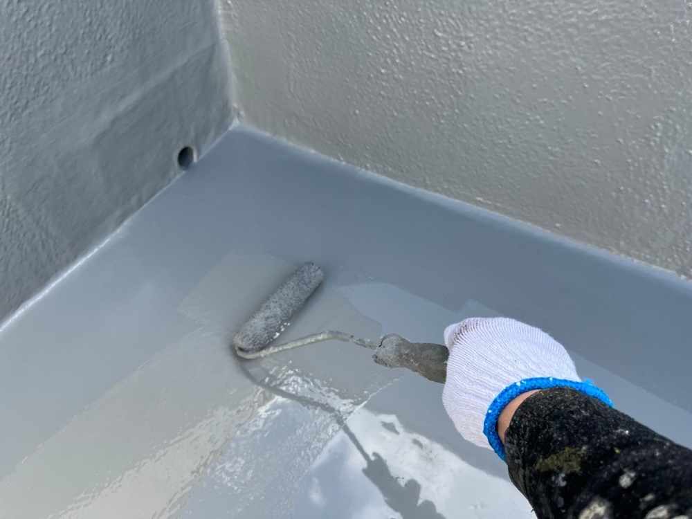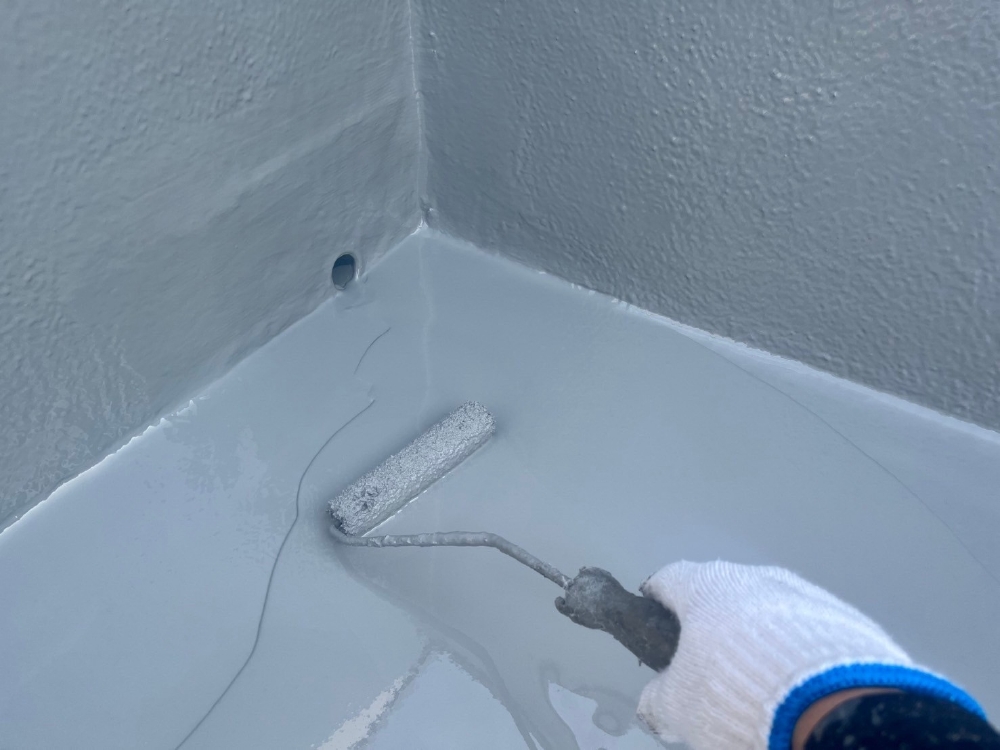 ウレタン樹脂の表面をトップコートで覆うことで保護し、屋上防水工事完了です。