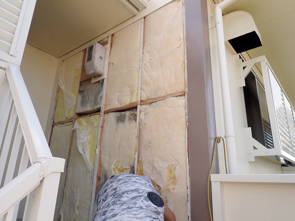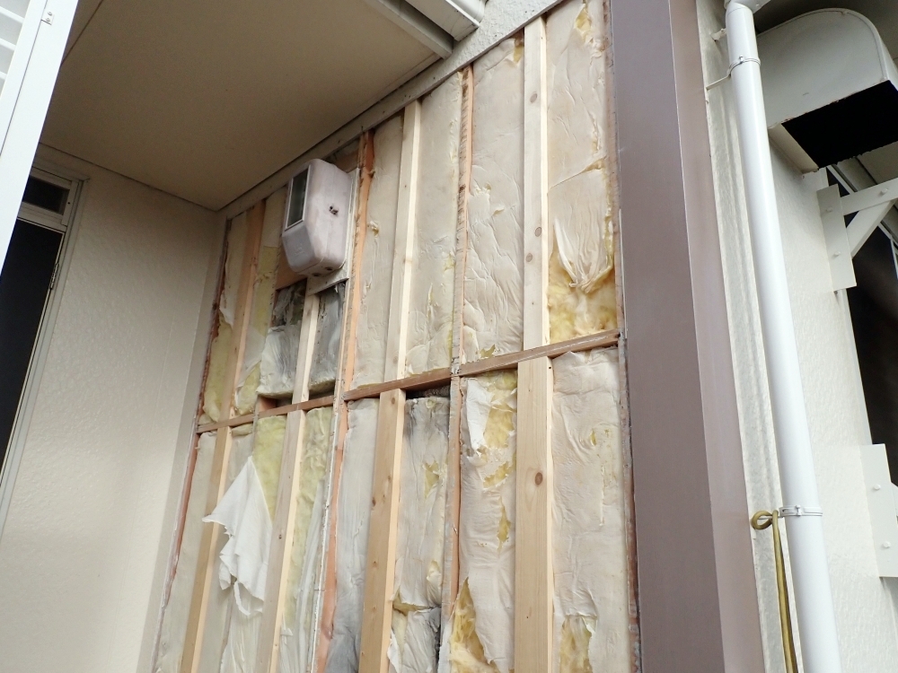 破損している部分のサイディングを解体撤去し、木材で下地を補強します。