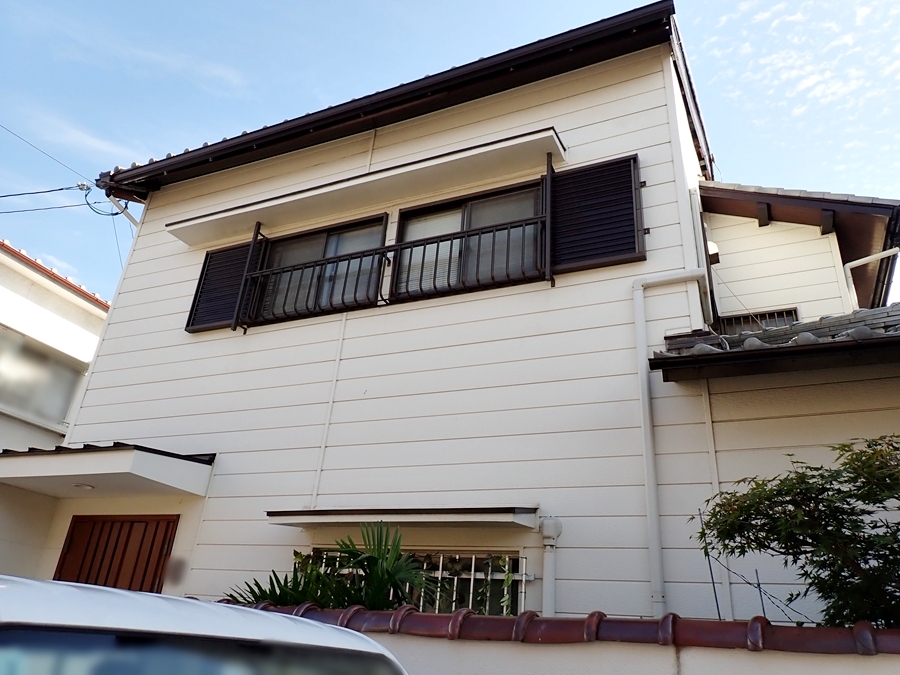 屋根の側面に取付けられている「破風板(はふいた)」の一部が剥がれ落ちていました。破風とは、家の屋根と軒天をつなぐ部分のことで、そこに取付けられた板を破風板といいます。破風板は屋根の傾斜がある側、雨樋がついていない側に取付けれていて、家を雨風から守るなど重要な役割があります。この部分の交換を行います。また周辺の瓦を点検したとことろ、一部補修が必要な場所がありましたので、足場を設置するこの機会にあわせて修繕をご提案しました。雨戸や小庇の塗装工事も行いましょう。