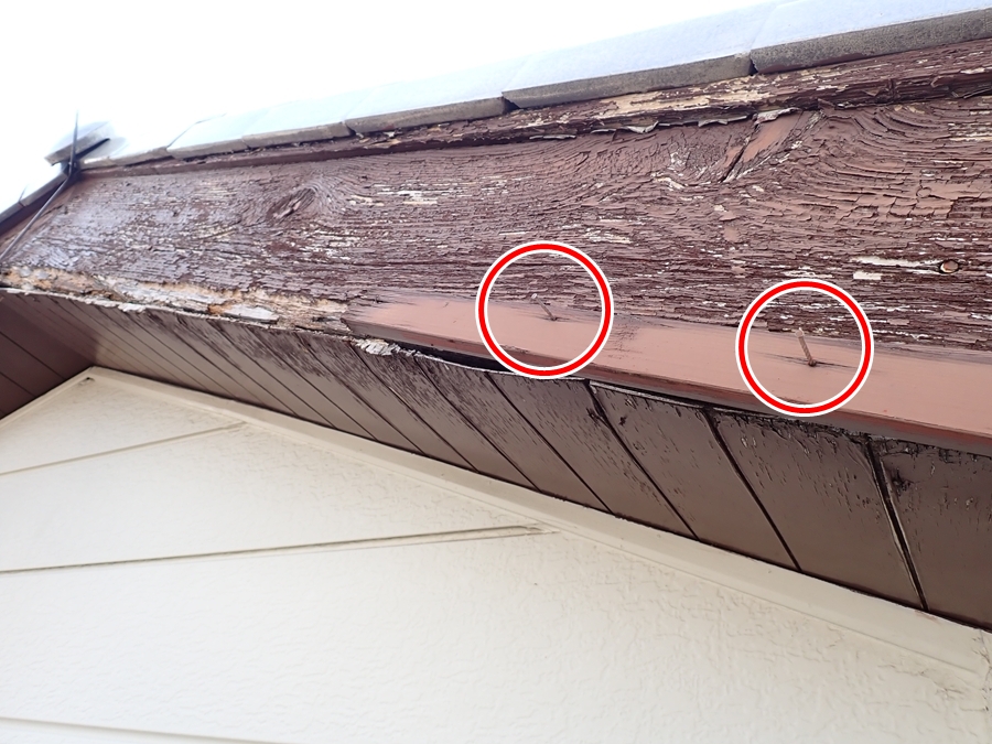 木材の劣化が進行していて、破風板をとめているビスが浮いています。