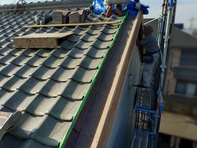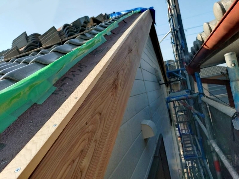 その後、古い破風板を撤去して新しいものに交換していきます。袖瓦をめくって瓦点検も行いました。