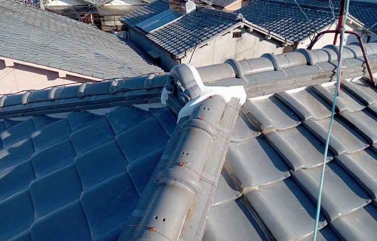 | 鬼瓦の周りにも漆喰を詰め、コーキングと銅線でしっかり固定して補強すれば工事完了です。 |